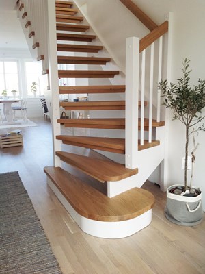 Här ser du exempel på olika trappmodeller som vi kan bygga. Vilken som passar dig bäst beror oftast på utrymmet men också tycke och smak. En L-trappa och U-trappa kan svänga både åt höger och vänster. Och har du gott om plats kan det vara en bra idé att låta trappan sticka ut och ta plats i rummet. Bläddra gärna mellan bilderna för att se exempel.